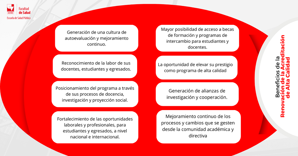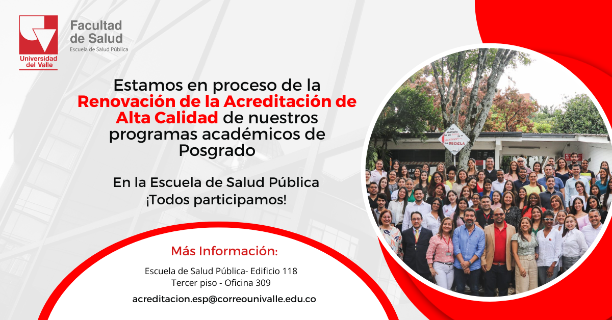 De acuerdo con las políticas emprendidas por la Universidad del Valle dirigidas a construir una cultura de calidad y mejoramiento continuo, en la Escuela de Salud Pública, durante el año 2022, hemos iniciado nuestro proceso de Autoevaluación con fines de Renovación de Acreditación en Alta calidad para de los programas de Maestría que ofrecemos.