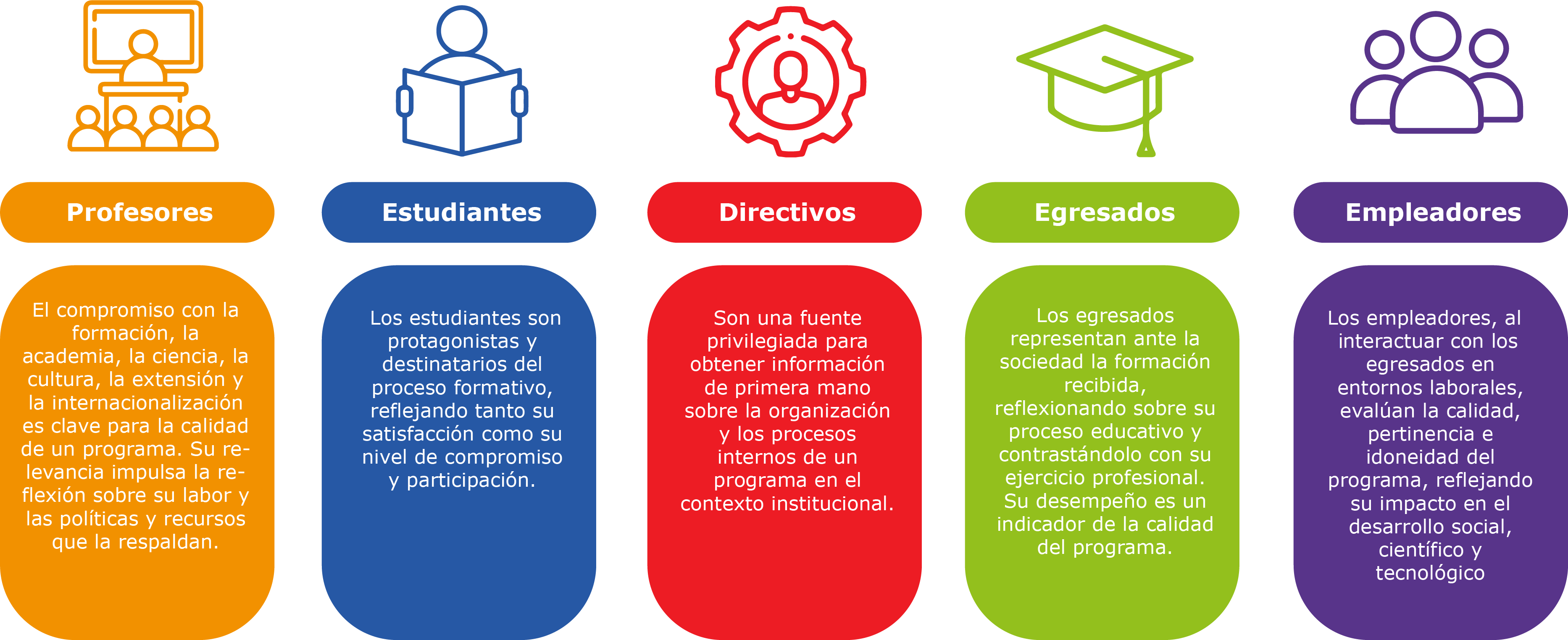 Son miembros tanto de la comunidad académica como del sector externo, son responsables y protagonistas en la evaluación, identificando fortalezas y debilidades. Su participación, definida por criterios específicos, fortalece el sentido de pertenencia y el compromiso, impulsando el desarrollo y mejora del programa y la institución.
