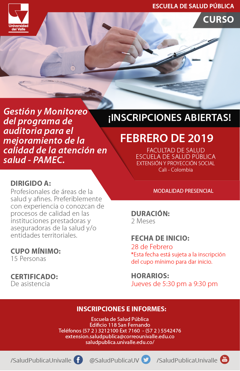 La Escuela de Salud Pública de la Universidad del Valle abrió inscripciones para la quinta edición del "Curso Taller para la implementación de la Calidad de la Atención en Salud “PAMEC" que se dictará a partir del 28 de febrero de 2019.