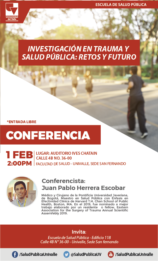 El pasado 01 de febrero de 2019 se realizó en la Escuela de Salud Pública de la Universidad del Valle, una conferencia sobre Investigación en Trauma y Salud Pública a cargo de Juan Pablo Herrera Escobar, médico y cirujano de la Pontificia Universidad Javeriana de Bogotá, maestro en Salud Pública con énfasis en efectividad clínica de Harvard T.H. Chan School of Public Health, Boston.